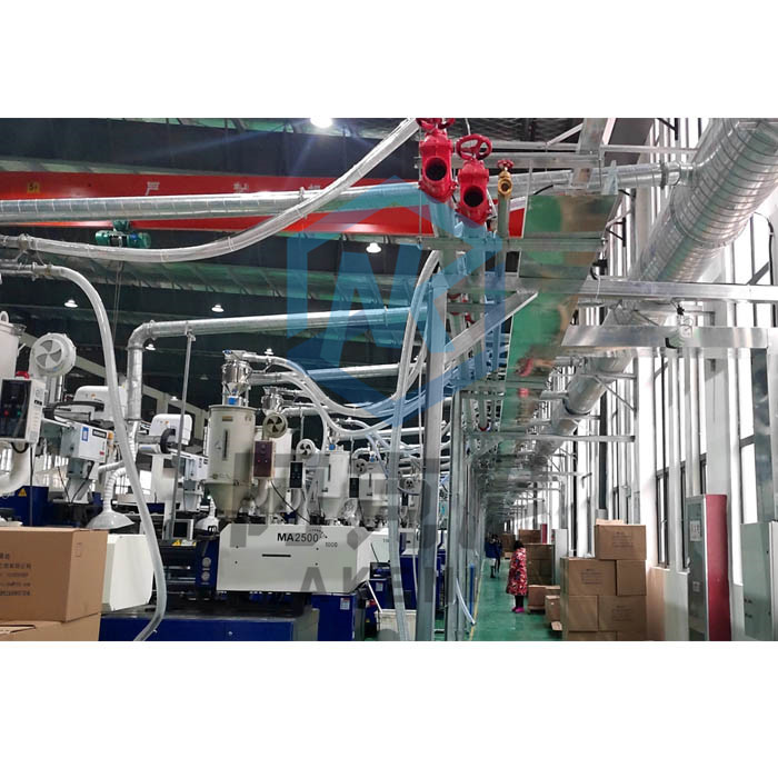 中·央供料系統、集中供料系統、統一供料系統實現原料集中處理、封閉輸送、徹底避免車間噪音、灰塵、熱氣污染。解決原料重復人工搬運的高成本及因疏忽而產生干燥不徹底的缺料問題,更不會混入不被允許的其它材料,更重要的是減少采購、耗電、維修成本,提高產品質量,提高工作效率。體現在